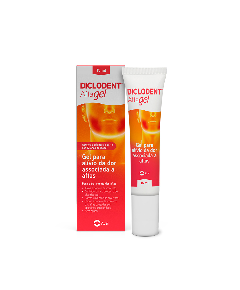 Diclodent Aftagel é um dispositivo médico para as úlceras bucais, aliviando a dor e o desconforto das úlceras na boca, apoiando o processo de cicatrização. Tem propriedades anti-inflamatórias e efeito calmante para a mucosa.